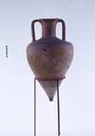 Description:   Pointed egg-shaped body with straight neck and echinus (mushroom) lip; handles shoulder to just below lip. A groove around neck, two more on the shoulder just below handle attachments; a sort of coarse rouletting around body at point of greatest circumference.