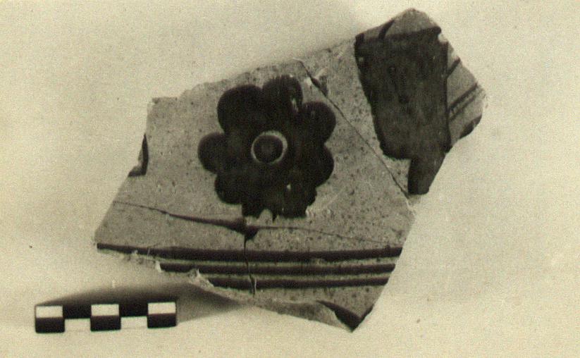 | Description: | From a very large pot of heavy fabric, unglazed inside. On the outside, above, unidentifiable object above triple black band; below, left, a figure in a long dress left; behind, a large blob rosette with a reserved ring inside it, and another unidentifiable fragment of an object to right. The objects seem first to have been drawn in outline, then filled in. Attic(?) clay; glaze black to reddish. | |