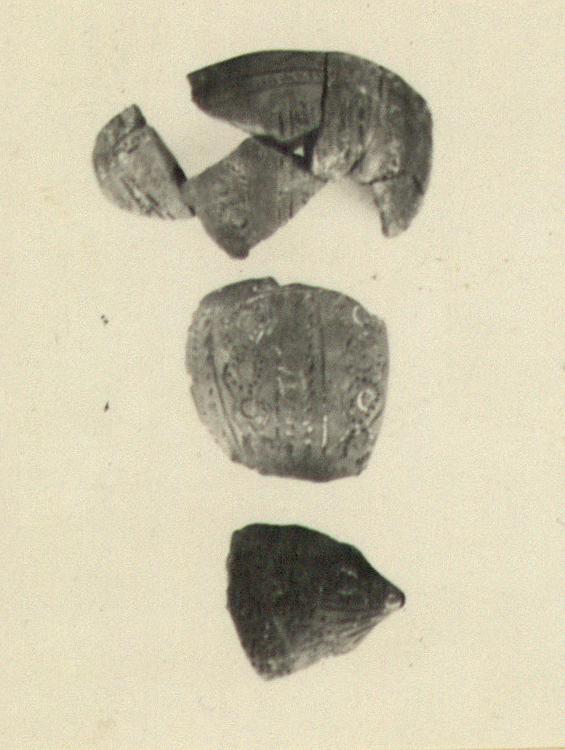 | Description: | Mended from six fragments; nearly half the rim but none of the base preserved. Incised filled decoration: around the rim, a large zigzag; below, a small hatched band; on the body, panels radiating from the bottom, of plain hatched bands and wavy lines of hatching alternating, with impressed circles in the curves of the latter. Handmade. For the ware cf. P 1669. Contemporary with fairly early Geometric. ADDENDA One rim fragment from pyre H 16:6; another, worn, from surface 43-45/Α-Ζ. | |