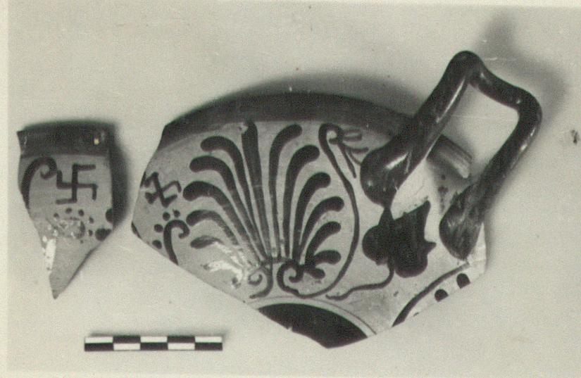 | Description: | Part of rim and body, with one handle. On outside, degenerate palmette and leaf pattern in black figure. Light red clay; poor black glaze on inside. | |