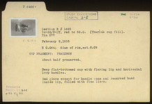 Description:   About half preserved. Deep flat-bottomed cup with flaring lip and horizontal loop handles.