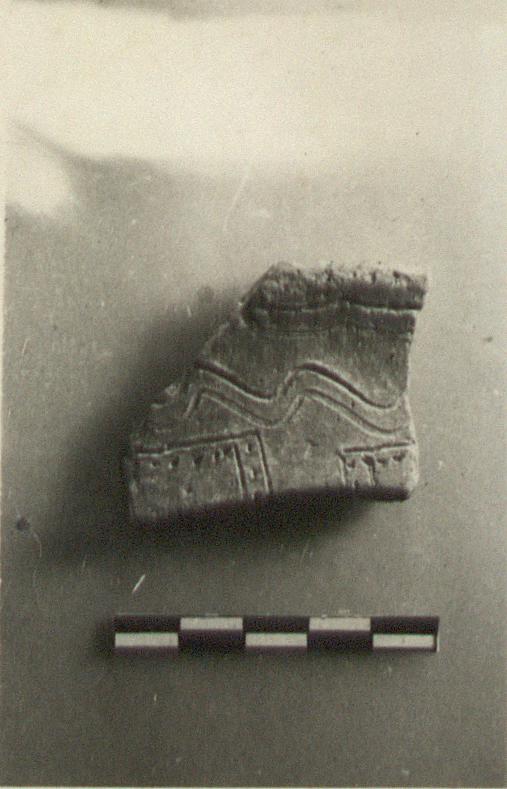 | Description: | From the rim of a coarse pitcher. Incised decoration. Two double wavy lines, above a decoration of squares with dots along their inner edges. Gritty micaceous red clay. | |