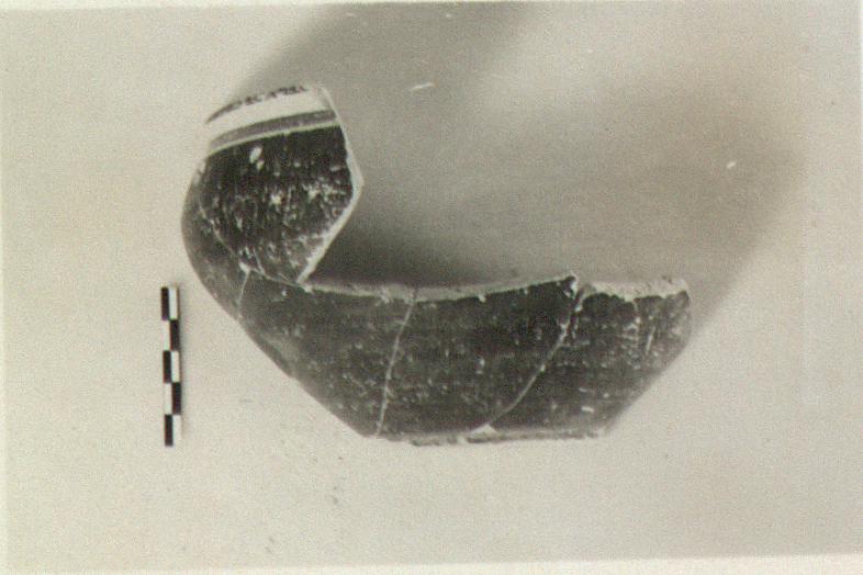 | Description: | Low base, short slightly flaring lip. No handles preserved. Entirely glazed black, except double reserved band outside lip and another decorated with series of strokes just inside the lip. | |