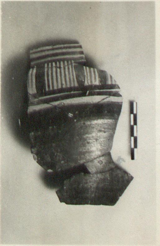 | Description: | None of the bottom preserved. Covered inside and outside to shoulder with brownish to black glaze. Reserved band with strokes inside rim. In handle zone, light vertical strokes divided into panels by broad vertical strokes. Outside rim, horizontal bands. Cf. P 5421, grave 20. | |