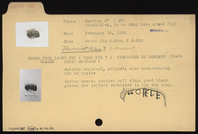 | Description: | Sherd from large pot, near rim? Outside unglazed, slipped; also down-sloping bit of inside. Inscribed in dry clay on concave black glazed upper surface: <graphic> Rather coarse pinkish-buff clay; good black glaze. | |