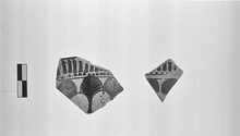 | Description: | Two small fragments from a kantharos with flaring lip. On outside of lip, vertical strokes, dotted below; on body, leaf pattern, a series of red leaves overlapping a black series. Leaf veins in thinned glaze on red leaves, added white on black. Cf. AJA 58 (1954) pp. 192, 194. | |