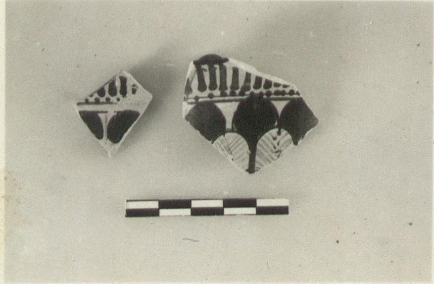 | Description: | Two small fragments from a kantharos with flaring lip. On outside of lip, vertical strokes, dotted below; on body, leaf pattern, a series of red leaves overlapping a black series. Leaf veins in thinned glaze on red leaves, added white on black. Cf. AJA 58 (1954) pp. 192, 194. | |