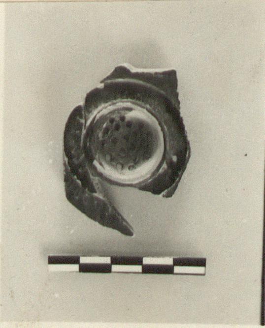| Description: | Broken all around. Circular strainer surrounded by a raised ring ridge; outside, a shallow raised ring. Ring of stamped egg pattern on raised ring, another around it. Black glaze on upper side, except for strainer which shows traces of red. Attic clay. | |