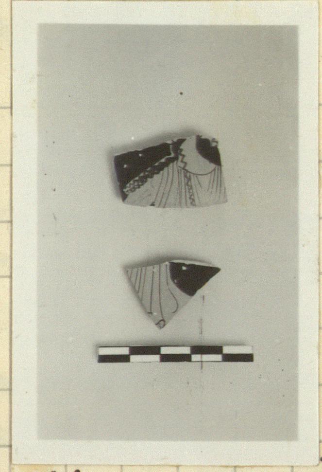 | Description: | From a smallish semi-closed pot; dull black glaze inside on lower part only. a) Part of head and shoulders of a wreathed bearded draped man, right. b) Small fragment with drapery. Relief contour for the bit of wreath preserved. Brown for the inner drawing of the arm. | |