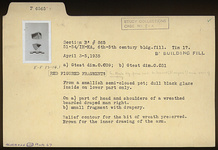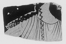 | Description: | From a smallish semi-closed pot; dull black glaze inside on lower part only. a) Part of head and shoulders of a wreathed bearded draped man, right. b) Small fragment with drapery. Relief contour for the bit of wreath preserved. Brown for the inner drawing of the arm. | |