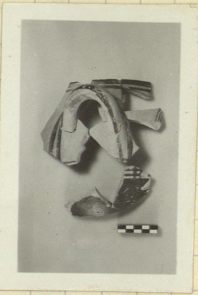 Description:   a) From the upper body and rim, with one handle. Two bands around outside of rim, and two at handle. Part of concentric circle decoration in handle zone to right. Black glaze inside.