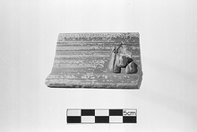 | Description: | The piece is from an almost vertical rim of a flat-floored Western Sigillata plate. A female head is applied in relief; the hair hangs down below the chin on each side. Glaze badly flaked outside; just below the lip a narrow band of light rouletting; inside, a deep groove. | |