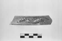 | Description: | Piece from a flat floored dish with vertical rim. Applied garland and leaves(?) on exterior of rim. A band of rouletting between wheel run grooves around the floor inside. Western Sigillata. | |