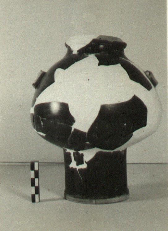 | Description: | Profile complete; body fragmentary. Restored in plaster. Double lug handles. Two mouldings around bottom of foot. Two small string-holes in lower body and two in rim. Lid missing. Good black glaze except on lug handles, rim and lower foot moulding, reserved. | |