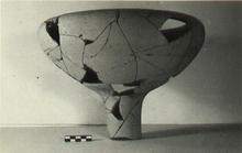 | Description: | Deep bowl-like body with inturned rim; spout straight, i.e. not tapering. Attic clay with white grits; bands of thin brown-black glaze, much peeled, inside and out. | |