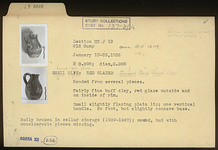 | Description: | Mended from several pieces. Small, slightly flaring plain lip; one vertical handle. No foot, but slightly concave base. Fairly fine buff clay, red glaze outside and on inside of rim. ADDENDA Badly broken in cellar storage (1939-1947); mended, but with considerable pieces missing. | |