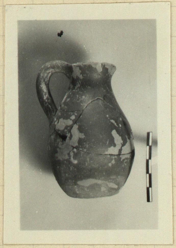 | Description: | Mended from several pieces. Small, slightly flaring plain lip; one vertical handle. No foot, but slightly concave base. Fairly fine buff clay, red glaze outside and on inside of rim. ADDENDA Badly broken in cellar storage (1939-1947); mended, but with considerable pieces missing. | |