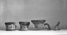 | Description: | Fragments from two large vases with decoration on neck in thin brownish-red glaze. a) Mended from two pieces; lip and bit of shoulder covered with streaked glaze. Between, on neck, reserved, large irregular motif; double concentric circle, and start of zigzag. Lip curves in at top. Pinkish-buff clay, inside unglazed. b) Mended from three pieces; lip a little shorter, heavier, and less incurving than on a). None of shoulder preserved. On neck, double concentric circle and pair of zigzags; at break, right, traces of start of handle. Clay pink to buff; unglazed inside. ADDENDA Agora Sample no. 255. | |