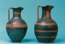 | Description: | Broken and mended, but complete. Ring foot, trefoil mouth, and vertical band handle. On handle, horizontal bands. Entirely covered with metallic black glaze, except for reserved band at point of greatest circumference filled with two narrow bands above and below a thinned glaze zigzag drawn from right to left; half way up neck, the same: one band above and below zigzag. The glaze somewhat peeled. | |