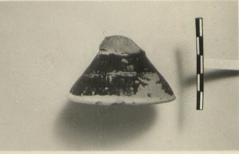 | Description: | Conical base similar to P 6691 (ΠΘ 273), but smaller. Reserved band around bottom. None of the floor preserved. Bluish-black glaze, somewhat peeled. | |