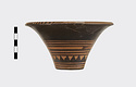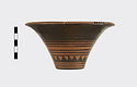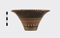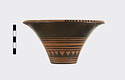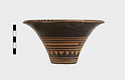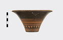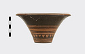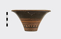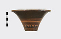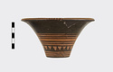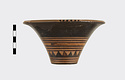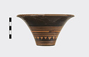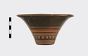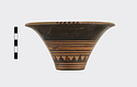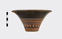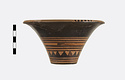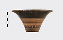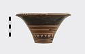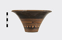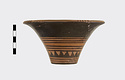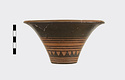 Description:   Rim somewhat broken and mended; a few pieces missing. Flat bottom, flaring concave side. From bottom: three reserved bands; tooth pattern; three reserved bands; zigzag; three reserved bands. Lip reserved and filled with series of parallel straight strokes. Interior glazed with reserved dot at center. On bottom, four reserved cross arms, not meeting at center.