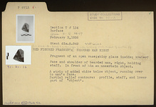 | Description: | Fragment of an open vase; shiny glaze inside; krater? Face and shoulder of bearded man, right, holding staff. In front of him an uncertain object. A strip of added white below object, running over to man's face. Partial relief contours: profile, staff, and lower part of object. | |