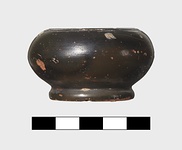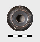 | Description: | Low flat base. Flat inner rim. Two grooves around outer edge of rim and just below it. Small central opening. Good black glaze over all. | |