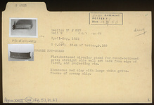 | Description: | Flat-bottomed circular stand for round-bottomed pots; straight side wall set back from edge of floor; projecting rim. Micaceous red clay with large white grits. Traces of creamy clip. | |