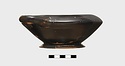 | Description: | About one-quarter of the body with most of the rim missing. Flaring ring foot, grooved on upper face. Lower and upper body meet at sharp angle; the upper body slightly convex with a turned down rim. One horizontal loop handle. Entirely covered with black glaze, except reserved band where rim turns down. Inside glazed nearly to shoulder; rings and dot underneath. | |