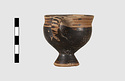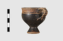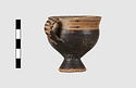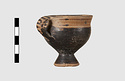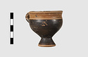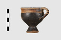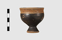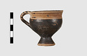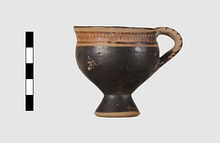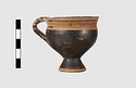 | Description: | Intact. Reserved lip, ornamented with zigzg between bands; inside lip reserved edge and one black band. Reserved dot on center of floor. Banded handle. Flaring foot. Glazed black inside and out. | |
