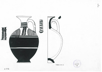 | Description: | About half of lip and large pieces of lower body missing. Banded neck and handle. Shoulder ornament, two sets of concentric semicircles, not compass-drawn, separated by vertical divisions, two lines between zigzags; then two bands. The body black, except for one reserved line. Burned; the glaze partly peeled. | |