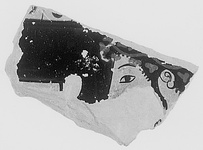 Description:   From a large closed pot (column krater), unglazed inside. Above, traces of border: tongue pattern? At right, youth's head, left, wearing purplish ivy wreath and a long lock before his ear. In front of him, a bit of some object, perhaps a cup or drinking horn. Cf. P 4674. Relief contours; hair outline reserved. There seems to be a pink wash over the flesh.