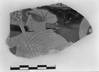 | Description: | From the shoulder of a large pot, probably a column krater. Inside, above unglazed; below, glazed, rather dull. Tongue pattern at top. Maenad, wearing chiton, himation and sakkos, left; an ivy spray and a thyrsos held in her left hand (hand not preserved); right arm outstretched. Behind her, a curved object, possibly the arm(?) of another figure. Relief contours for chin, nape of neck outstretched arm, and staff of thyrsos. Purple-red for the ivy spray; brown for inner drawing on arm. | |