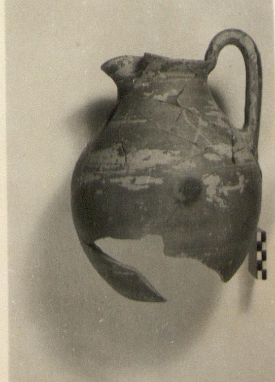 | Description: | Base missing; body much mended; fragments missing. Trefoil mouth; plain band handle. Double bands of added white on lower body and below handle zone; one(?) band below lip. On shoulder, alternating loops, and vertical stripes of running dog in added white. Red glaze, somewhat peeled. | |