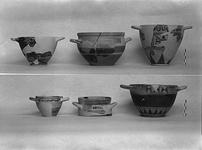 | Description: | One handle and fragments from rim and wall missing. Low ring foot; concentric circles and dot underneath. Rays with narrow bands above and below, above foot. Black glaze to handle zone. In handle zone, vertical bands with three horizontal hourglasses on each side. Attic clay; black glaze. Imitation of Corinthian. | |