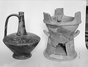 Description:   Base, neck and most of one side of body preserved. Handle and much of walls restored in plaster. Heavy flaring ring foot, grooved; sides very flaring; shoulder wide and at a sharp angle to the walls; at either side of neck, close to top, a small knob; plain lip, with a deep groove just below the edge; groove around base of neck.