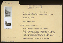 | Description: | Wall fragment, broken all around. Head of siren to left with space fillers in field. Purple paint for eye, hair and wing; incision throughout for figure. On inside a horizontal band of black glaze. Clay dull buff; greenish on inside. | |