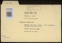 | Description: | Mended from many pieces; a few fragments missing from the walls. Widely flaring shape. Color red to gray. | |