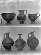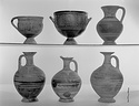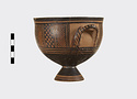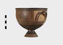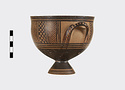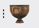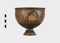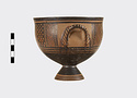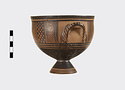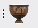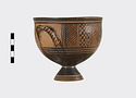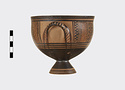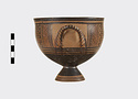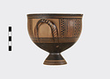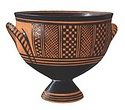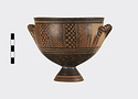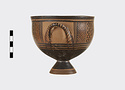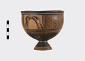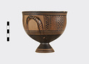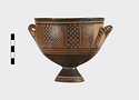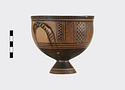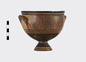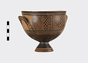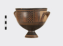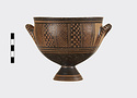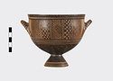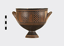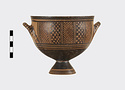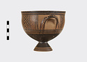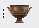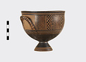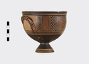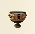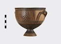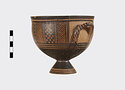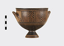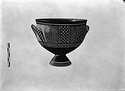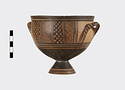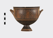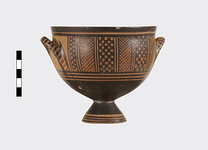 | Description: | Conical base and two upward tilted handles, horizontal; banded vertically. Reserved bands around bottom of base. On body, vertical bands (triple) separate panels filled alternately by checkerboard and crosshatching. Zigzags define handle panels. Reserved line inside lip; reserved dot at center inside. Excellent black to brown glaze. | |