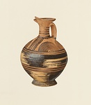 | Description: | Chip missing from lip; lip warped. Flaring ring foot and round body with narrow straight neck and flaring round mouth; one band handle, shoulder to below lip. Lower body and foot glazed black, much peeled, with three reserved bands. On shoulder, compass-drawn half-circles, concentric, and three straight and two wavy lines, down front. Bands on neck and handle. | |