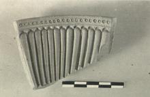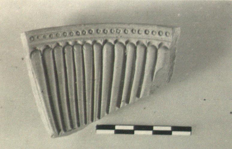 | Description: | From the upper part of a bowl, cut(?) at the left side. Three grooves on outside. Inside, a crisp mold for a bowl of the long-petalled variety, with dots in a groove around the rim. Cf. P 20518, jewelled rim. | |