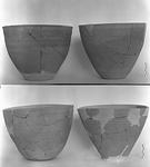 Description:   Much missing from rim and walls; the bottom chipped. Flaring type. A large hole broken away in the bottom. Around the outside, incomplete knife lines and four broad wheelrun grooves.