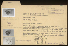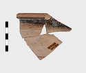 | Description: | Mended from three pieces; part of the rim and wall of a small semiglazed krater; narrow rolled rim. Glazed inside, on the rim, and for a broad band just below it; also on a band lower down on the wall. Inscribed inside. To the left of the name and below it are scratched designs, including a human head: <graphic> | |