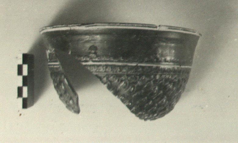| Description: | Much of wall and base missing. One fragment does not join. Restored in plaster. Side wall covered with fronds. Zone of egg and triple dart with a band of double spirals, from which flowers rise at intervals, above. About the egg and dart, glaze scraped away from a groove, as also below rim. Good workmanship and glaze. | |