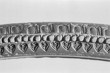 | Description: | From the rim of a large Pergamene plate. On outer face of rim, egg and tongue; on top, beads; on inner face, heart-shaped leaves with circles inside, all stamped. Cf. Hesperia Suppl. 10 (1956), p. 107, under no. 119. ADDENDA Another small rim fragment (b) found in mending; Max. Dim. 0.075. P 6444 and P 5881 are identical in size and ornament and may belong. | |