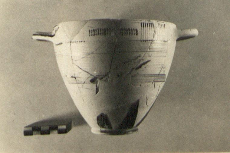 | Description: | Many fragments missing; restored in plaster, including one handle. Ring foot. Large rays around bottom; then fine bands to handle zone. In handle zone, vertical bands, interrupted at the middle on each side by short vertical zigzags. Glaze brown to yellow; somewhat peeled. Protocorinthian. | |