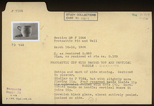 | Description: | Bottom and much of side missing. Restored in plaster. Similar to P 7164 but with slightly more flaring lip. Horizontal bands on handle; vertical where it joins lip. Incised on side: <graphic> Brownish-black glaze, almost entirely peeled. ADDENDA P 7164: Deep, with flaring rim and one vertical strap handle from rim. | |
