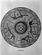 | Description: | About half preserved, with gaps. Restored in plaster. Low ring foot and deep convex side; no handles. Underneath, two glazed rings and Maltese cross. On body, procession of lions left, their feet toward the rim; part of three preserved (face of one on a small non-joining fragment). Filling ornament; loops and vegetal motif, parallel zigzags; dotted running dog. On rim, double-curved lines. Inside black glaze; reserved band at rim with series of strokes; at one point, shallow depression with black glaze, for pouring(?). | |