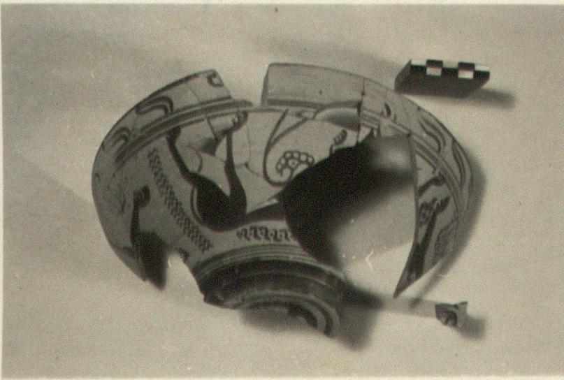 | Description: | About half preserved, with gaps. Restored in plaster. Low ring foot and deep convex side; no handles. Underneath, two glazed rings and Maltese cross. On body, procession of lions left, their feet toward the rim; part of three preserved (face of one on a small non-joining fragment). Filling ornament; loops and vegetal motif, parallel zigzags; dotted running dog. On rim, double-curved lines. Inside black glaze; reserved band at rim with series of strokes; at one point, shallow depression with black glaze, for pouring(?). | |