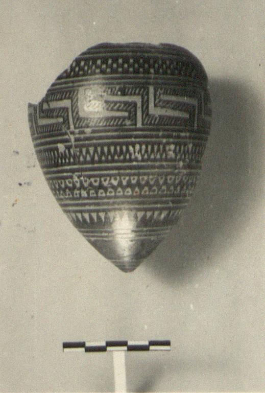 | Description: | Fragments missing from wall and rim; restored in plaster. From bottom: two groups of reserved bands; rays; interlocking tooth pattern, dotted; zigzag; hatched maeander to left; checkerboard; each zone separated by reserved bands. Rim flanged inside for lid, and flange pierced. | |